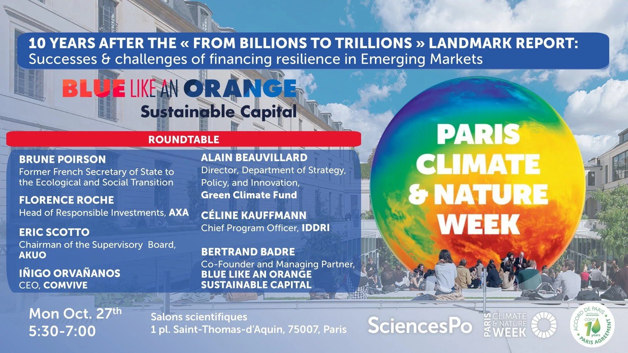 Blue like an Orange is taking part to the inaugural Paris Climate & Nature Week by organizing a roundtable on the Successes & challenges of financing resilience in Emerging Markets, together with Axa, IDDRI, COMVIVE, Green Climate Fund and Akuo Group.