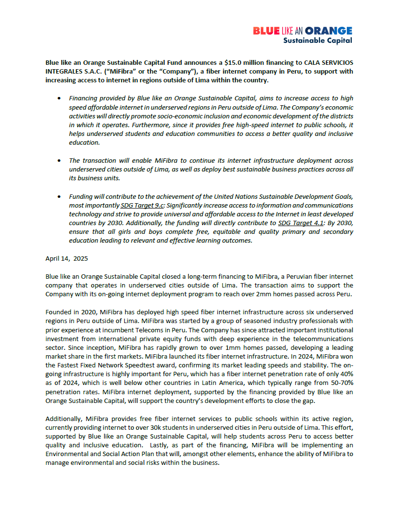 Blue like an Orange Sustainable Capital Fund announces a $15.0 million financing to CALA SERVICIOS INTEGRALES S.A.C. (“MiFibra” or the “Company”), a fiber internet company in Peru, to support with increasing access to internet in regions outside of Lima within the country.